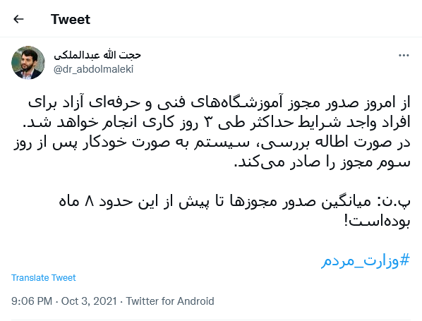 پایگاه خبری اختبار- دکتر حجت الله عبدالملکی وزیر تعاون، کار و رفاه اجتماعی، صبح امروز با ارسال یک توییت اعلام کرد از امروز ۱۱ مهر ۱۴۰۰ مدت زمان صدور مجوز آموزشگاههای فنی و حرفهای آزاد، از ۸ ماه به ۳ روز کاهش یافته است.