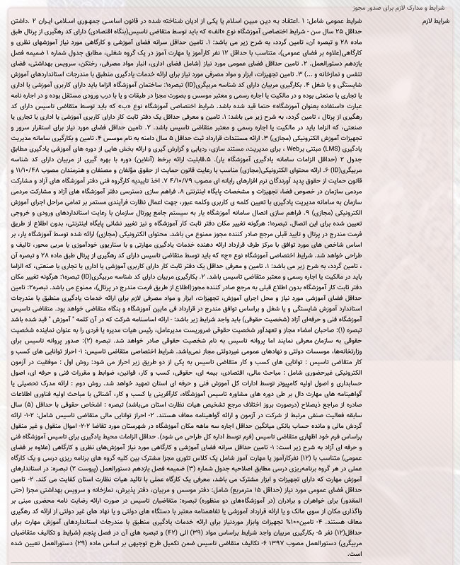 در قسمت شرایط و مدارک لازم برای صدور مجوز آموزشگاه فنی و حرفه ای آزاد هم شرح مفصلی از موارد مختلف با جزئیات ذکر شده است که متقاضی باید همه آن را تهیه و ارائه کند.(تصویر زیر ۱۴۰۰/۰۷/۱۱ تهیه شده است)