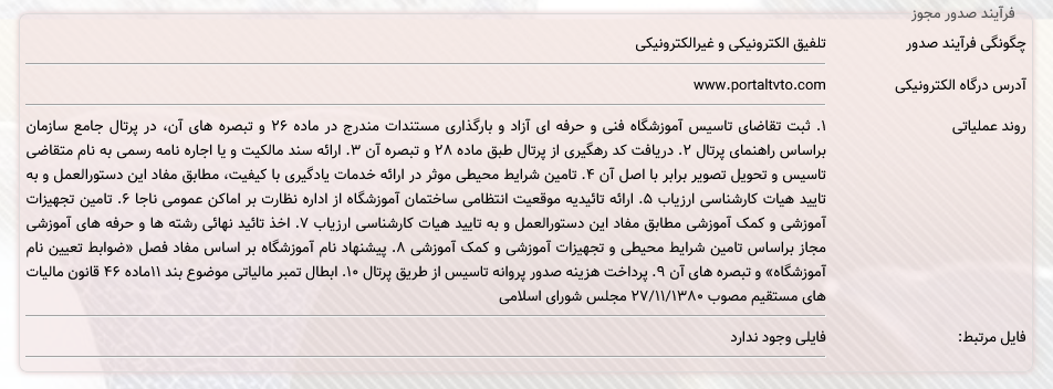 فرآیند صدور مجوز آموزشگاه فنی و حرفه ای آزاد در درگاه ملی مجوزها این طور اعلام شده است: