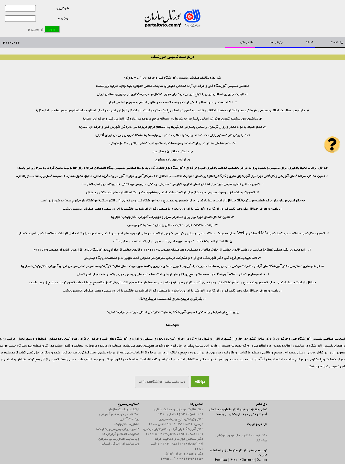 عین همین مدارک و فرایندها در پورتال سازمان فنی و حرفه ای به نشانی www.portaltvto.com که متقاضیان باید درخواست خود را آنجا ثبت کنند نیز درج شده است. (تصویر زیر ۱۴۰۰/۰۷/۱۱ تهیه شده است)