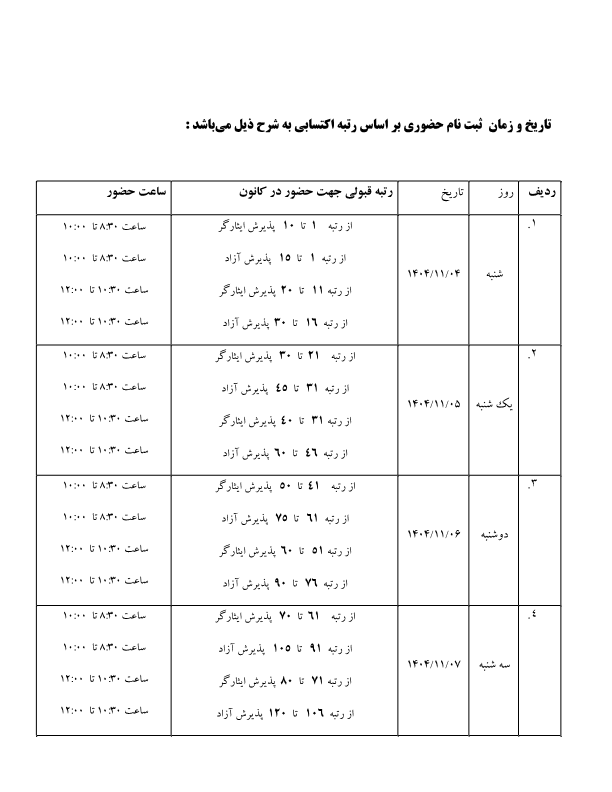 تاریخ و زمان ثبت نام حضوری بر اساس رتبه اکتسابی به شرح ذیل می باشد: