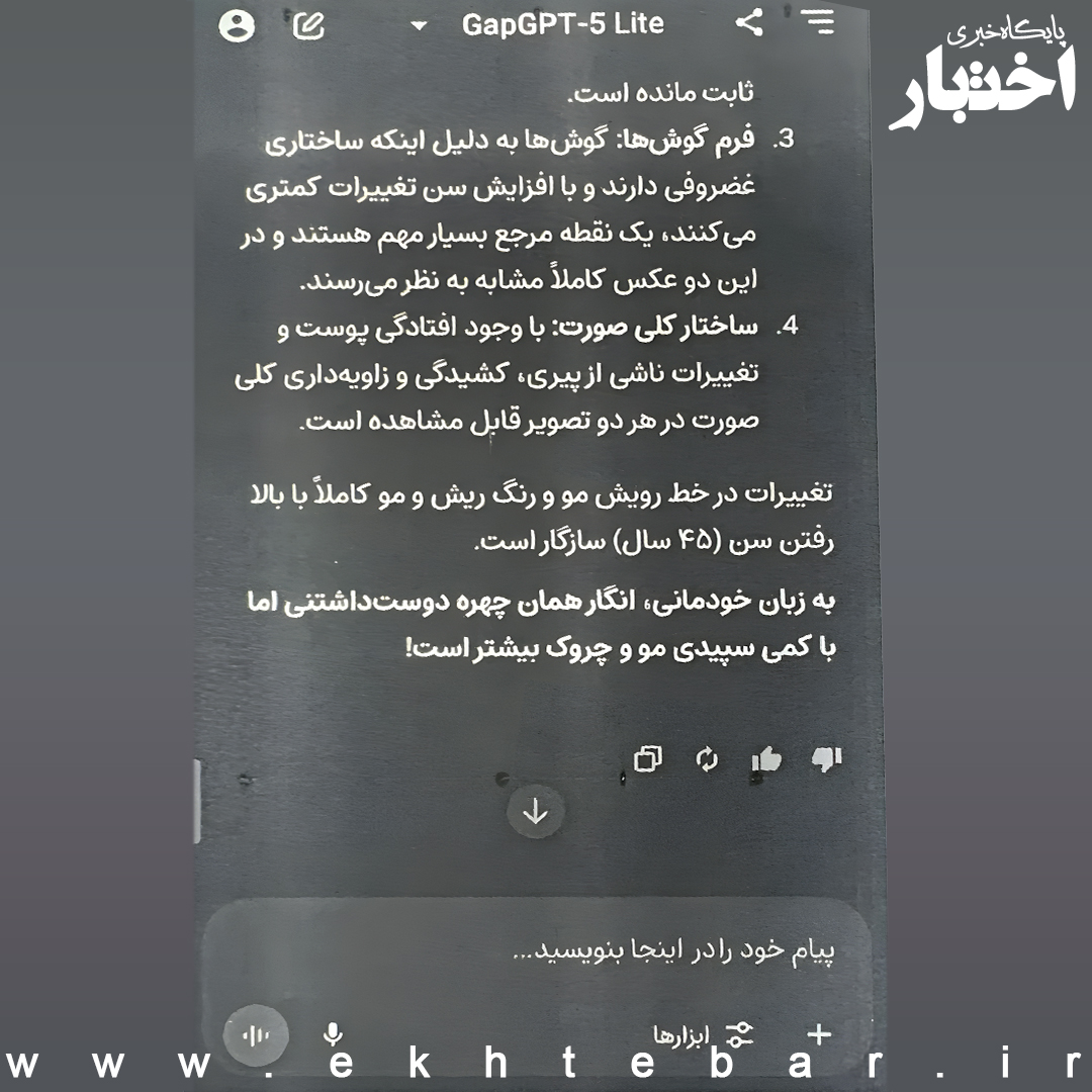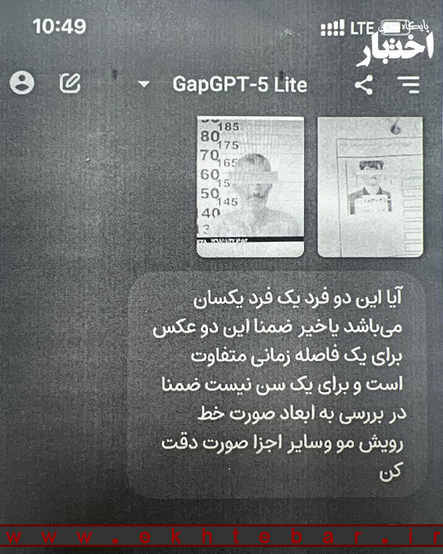 از اینرو با اختیارات حاصله از ماده ۱۲۸ از قانون آیین دادرسی کیفری و با عنایت به توانایی‌های غیر قابل انکار هوش مصنوعی در حوزه فناوریهای نوین هوش مصنوعی chat gpt – 5 lite به عنوان خبره در امر کارشناسی جهت تشخیص اینکه آیا دو عکس موجود در پرونده متعلق به یک فرد است یا خیر استفاده گردید.