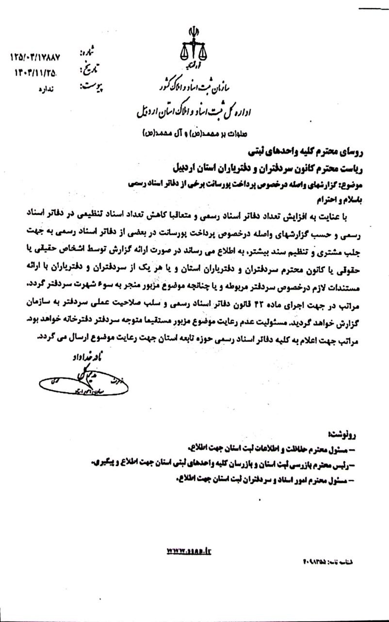 هشدار مدیرکل ثبت اسناد و املاک استان اردبیل درخصوص پرداخت پورسانت در برخی دفاتر اسناد رسمی