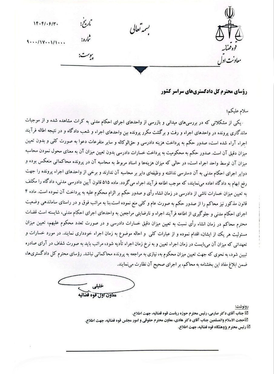 بخشنامه شماره ۹۰۰۰/۱۷۰۰۱/۱۰۰۰ مورخ ۱۴۰۴/۰۶/۳۰ معاون اول قوه قضاییه