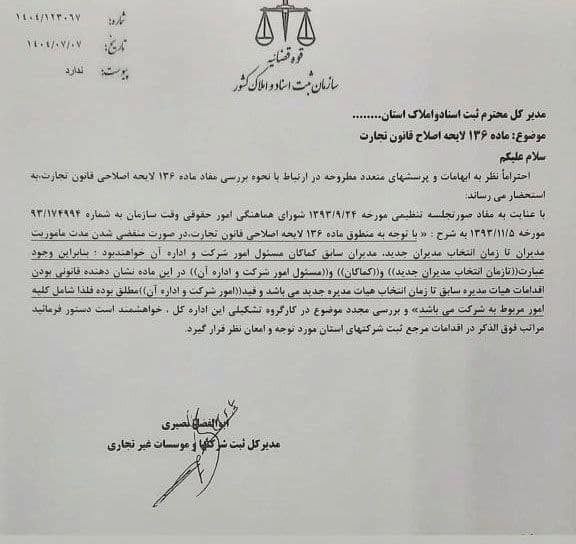 با عنایت به مفاد صورتجلسه تنظیمی مورخه ۱۳۹۳/۹/۲۴ شورای هماهنگی امور حقوقی وقت سازمان به شماره ۹۳/۱۷۴۹۹۴ مورخه ۱۳۹۳/۱۱/۵ به شرح: «با توجه به منطوق ماده ۱۳۶ لایحه اصلاحی قانون تجارت در صورت منقضی شدن مدت ماموریت مدیران تا زمان انتخاب مدیران جدید، مدیران سابق کماکان مسئول امور شرکت و اداره آن خواهند بود: بنابراین وجود عبارت «تا زمان انتخاب مدیران جدید» و «کماکان» و «مسئول امور شرکت و اداره آن» در این ماده نشاندهنده قانونی بودن اقدامات هیات مدیره سابق تا زمان انتخاب هیات مدیره جدید میباشد و قید امور شرکت و اداره آن مطلق بوده، فلذا شامل کلیه امور مربوط به شرکت میباشد و بررسی مجدد موضوع در کارگروه تشکیلی این اداره کل، خواهشمند است دستور فرمائید مراتب فوقالذکر در اقدامات مرجع ثبت شرکتهای استان مورد توجه و امعان نظر قرار گیرد.