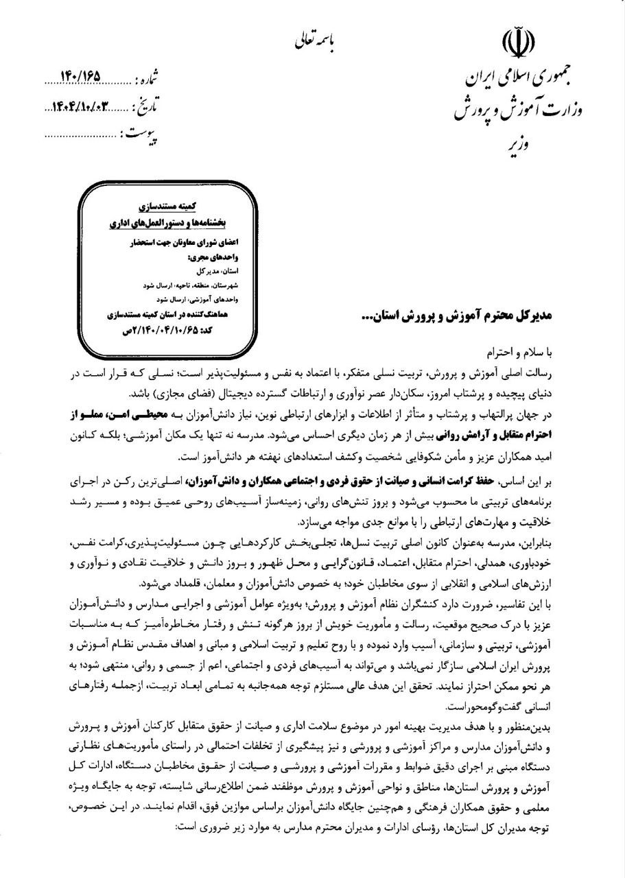 به گزارش اختبار، بخشنامه ممنوعیت تنبیه بدنی دانش آموزان و سوء رفتار با آنها به هر علت و تحت هر شرایطی، با امضای «علیرضا کاظمی» وزیر آموزش و پرورش به ادارههای کل، مناطق و مدارس سراسر کشور ابلاغ شد.