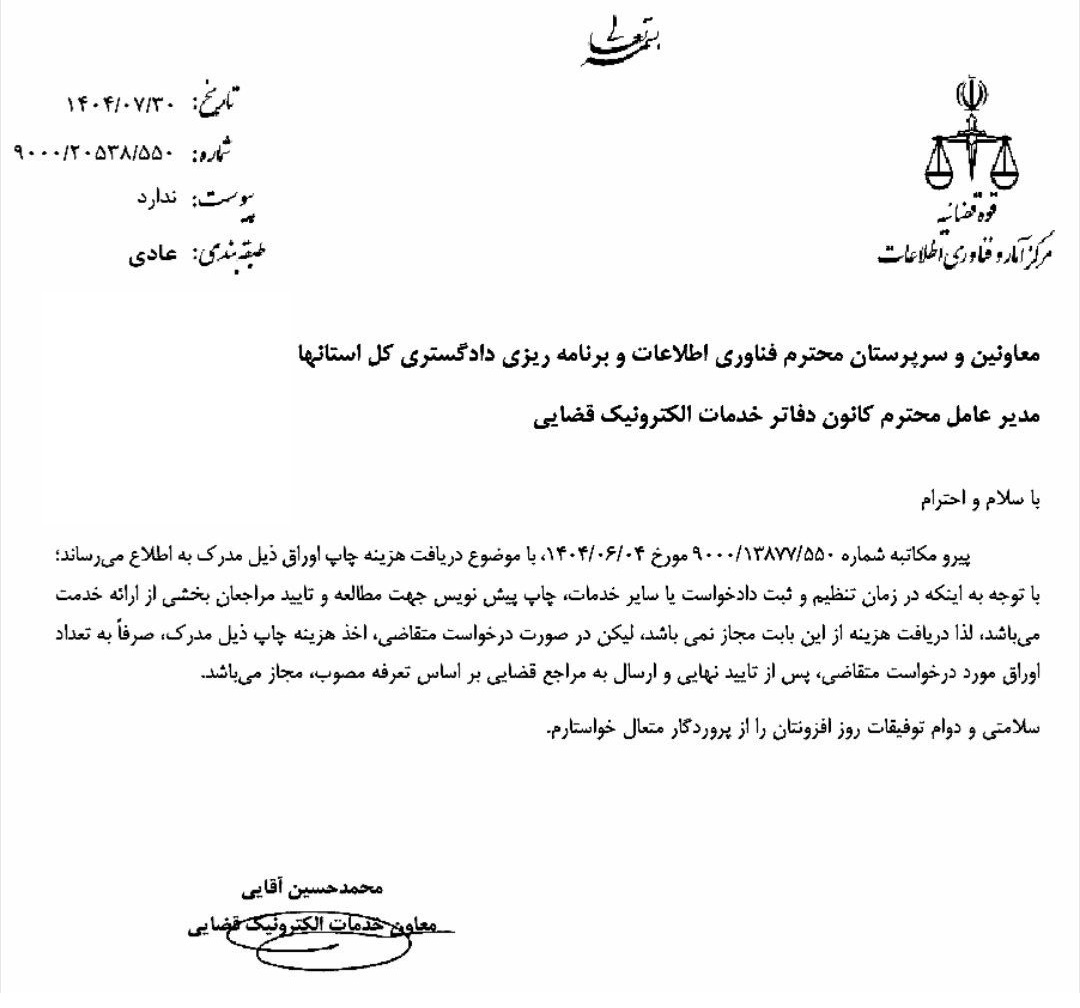 پیرو مکاتبه شماره ۹۰۰۰/۱۳۸۷۷/۵۵۰ مورخ ۱۴۰۴/۰۶/۰۴ با موضوع دریافت هزینه چاپ اوراق ذیل مدرک به اطلاع می‌رساند؛ با توجه به اینکه در زمان تنظیم و ثبت دادخواست یا سایر خدمات چاپ پیش نویس جهت مطالعه و تایید مراجعان بخشی از ارائه خدمت می باشد، لذا دریافت هزینه از این بابت مجاز نمی‌باشد لیکن در صورت درخواست متقاضی اخذ هزینه چاپ ذیل مدرک، صرفاً به تعداد اوراق مورد درخواست متقاضی پس از تایید نهایی و ارسال به مراجع قضایی بر اساس تعرفه مصوب مجاز می‌باشد.