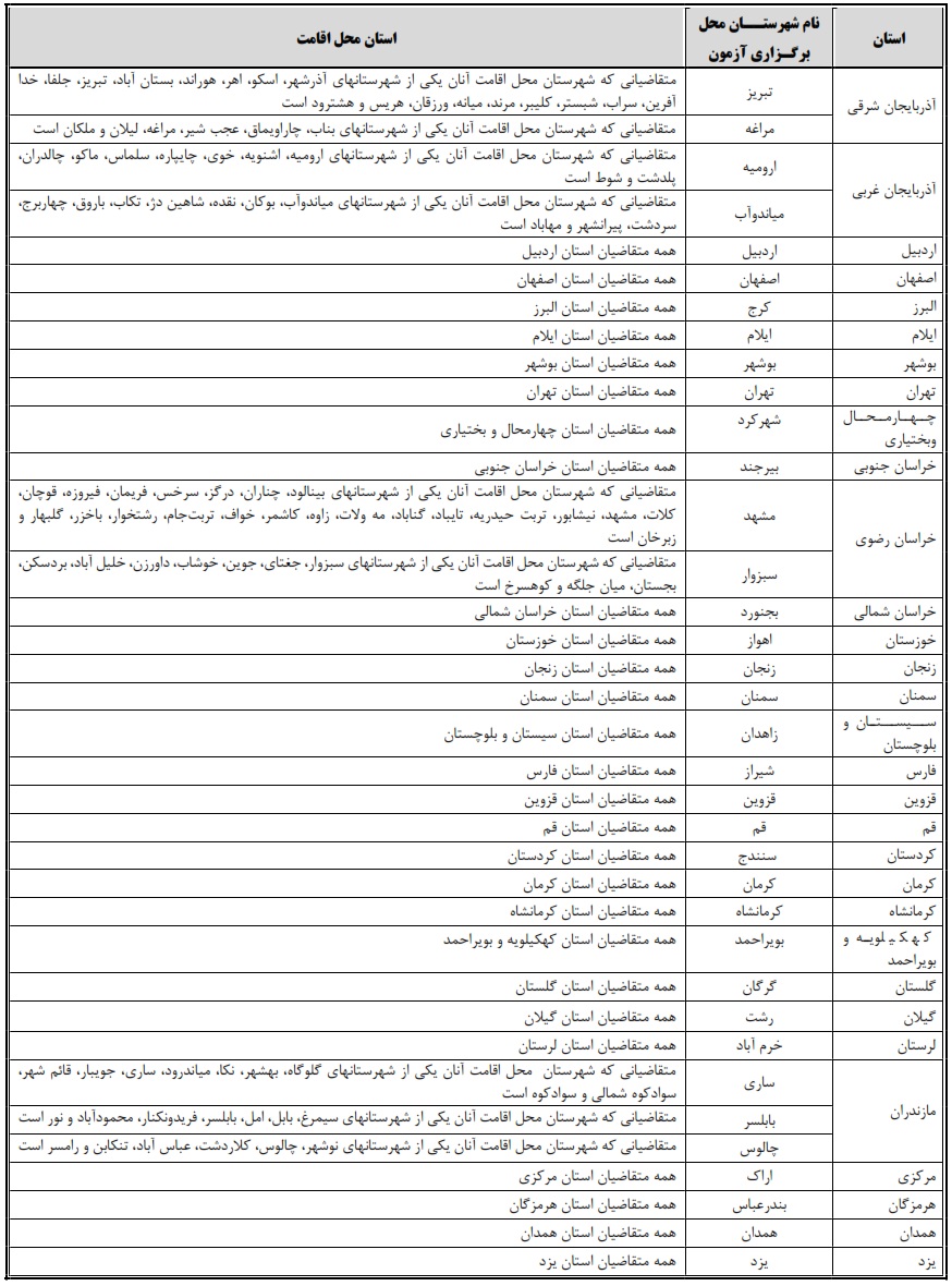 آزمون وکالت کانون وکلای دادگستری در ۳۶ شهرستان برگزار میشود. شهرهای محل آزمون به شرح جدول ذیل میباشد: