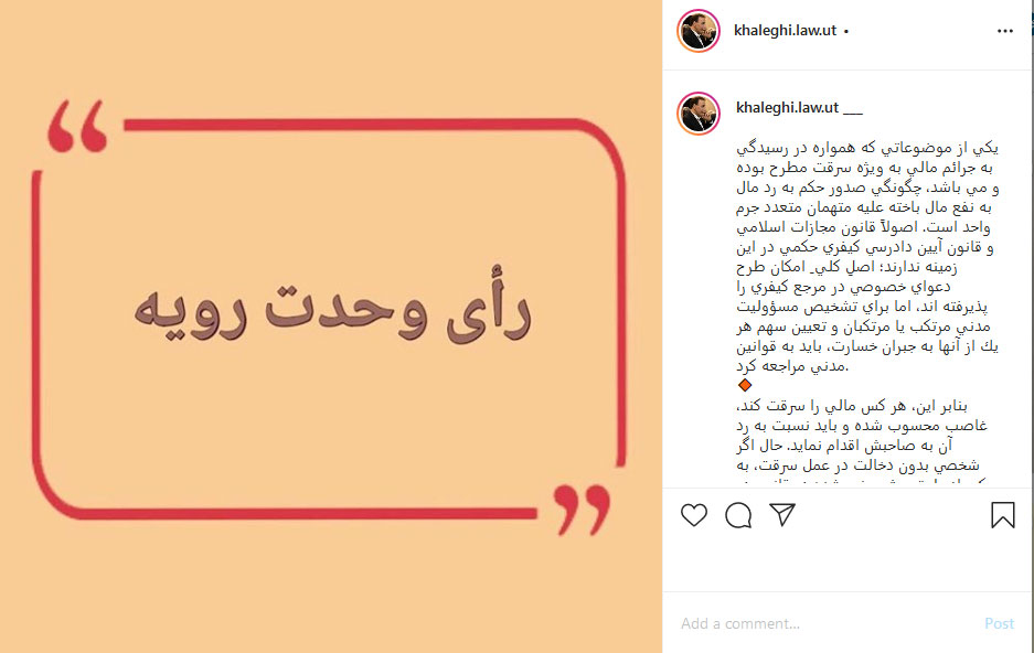 پایگاه خبری اختبار- دکتر علی خالقی وکیل دادگستری و استاد برجسته آیین دادرسی کیفری در حساب اینستاگرامی خود از صدور رای وحدت رویه جدید در مورد عدم مسوولیت تضامنی سارقین در رد مال از سوی هیات عمومی دیوان عالی کشور خبر داد.