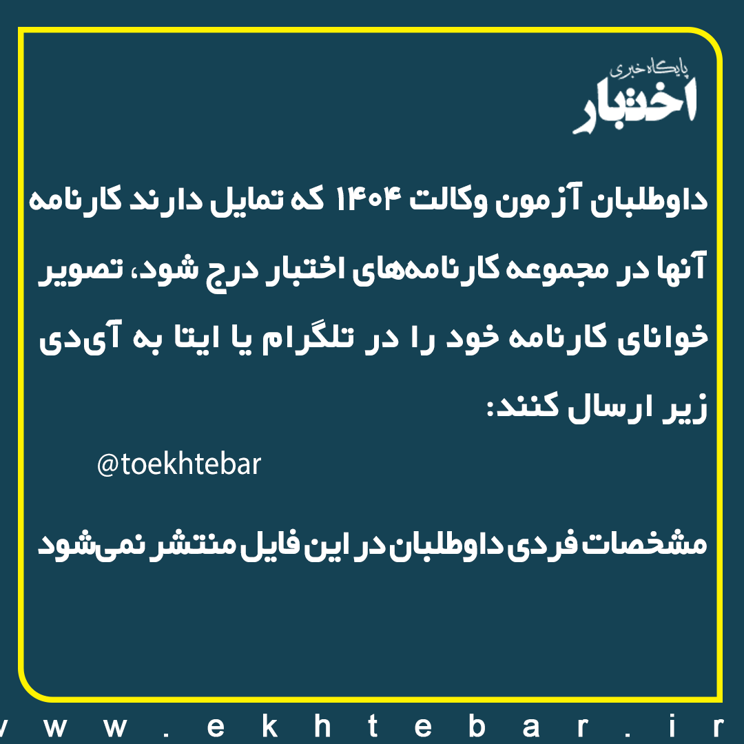 پایگاه خبری اختبار- پایگاه خبری اختبار طبق روال سال های گذشته امسال هم قصد دارد تا با جمع آوری و انتشار کارنامه داوطلبان آزمون وکالت، منبع اطلاعات مفیدی برای استفاده داوطلبان آزمون های پیش رو فراهم کند.