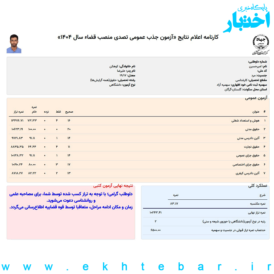 امیرحسین کوهکن هستم، دانشجوی کارشناسی ارشد حقوق کیفری و جرم شناسی دانشگاه شهید بهشتی تهران که توانستم در آزمون قضاوت (جذب عمومی) سال ۱۴۰۴ رتبه ۲ کشور را کسب کنم.