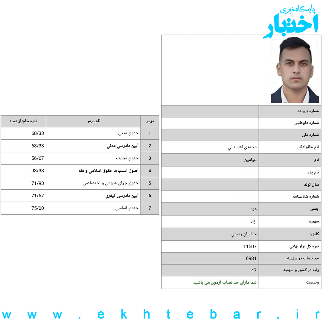 پایگاه خبری اختبار- بنیامین محمدی متولد سال ۱۳۷۵ و دانشجوی کارشناسی ارشد حقوق خصوصی دانشگاه تهران است که در آزمون قضاوت ۱۴۰۴ کل کشور موفق به کسب رتبه ۱ شده است.