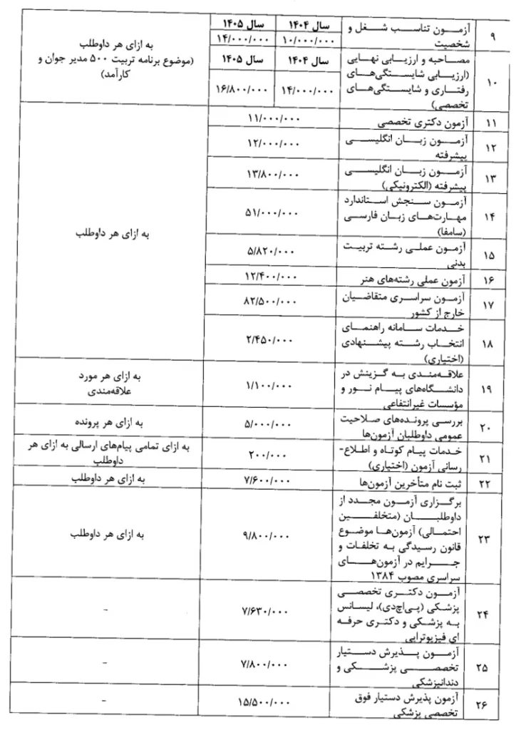 ۱- هزینه خدمات ثبتنام دریافتی از داوطلبان شرکت در آزمونهای سازمان سنجش آموزش کشور در سال ۱۴۰۵ مطابق پیشنهاد سازمان یادشده و توافق وزارت علوم، تحقیقات و فناوری و سازمان برنامه و بودجه کشور به شرح جدول زیر تعیین میشود. درآمدهای سازمان سنجش آموزش کشور، وزارت بهداشت، درمان و آموزش پزشکی و وزارت آموزش و پرورش به حساب درآمدی مربوط نزد خزانهداری کل کشور واریز و مراتب در بخش درآمدهای اختصاصی و یا عمومی بودجه کل کشور حسب مورد منظور میگردد و معادل هزینههای مورد نیاز برگزاری آزمونها از طریق درج در ردیفهای بودجه هزینهای و تملک داراییهای سرمایهای سازمان مذکور و وزارتخانههای یادشده در لایحه بودجه سنواتی پیشبینی و در اختیار آنها قرار میگیرد: